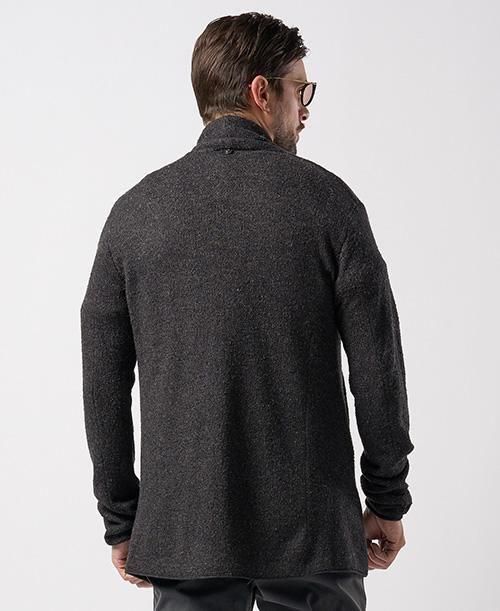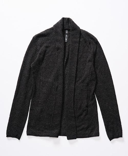 異なる2種の糸で編み立てることで独特な雰囲気で仕上げている。サラッと羽織れるボタンレスカーディガン。ミドル丈とすることで、スタイリングアイテムとして汎用性のあるデザインに仕上げた。