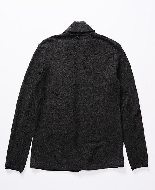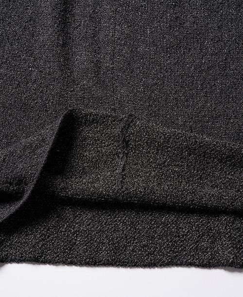 ・袖、裾に天竺ロールを施し、wjkらしいアクセントとしている。綿レーヨンシルクの交撚糸とウール混の風合いの良いドラロンリングヤーンで編み立てたバックパイルニット。