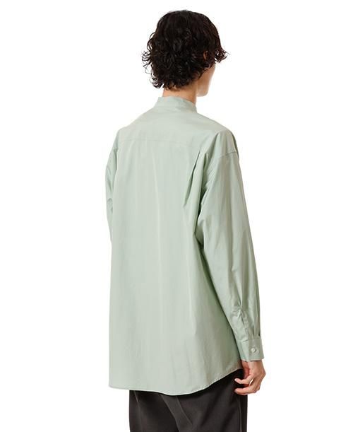 エジプトのギザ綿を100%使用した超高番手のブロード地。ギザ糸独特な光沢感のある風合いは肌触りも格別。上質生地の贅沢な着用感を楽しみたい。ややゆとりのあるバンドカラーL/Sシャツ。